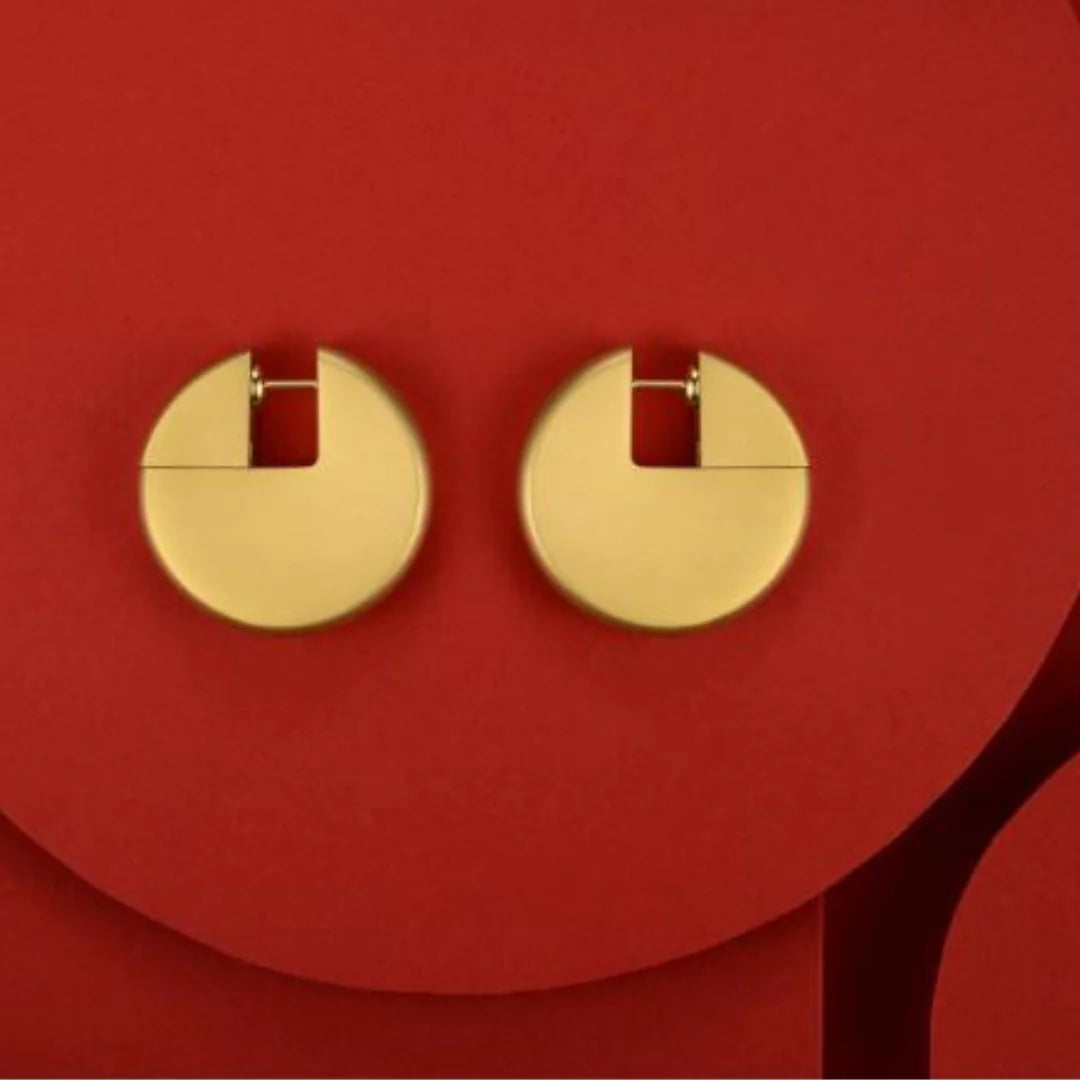 A statement pair. Stainless steel with gold or rose gold plating featuring a very secure, closure. Remove the back triangle and voila!